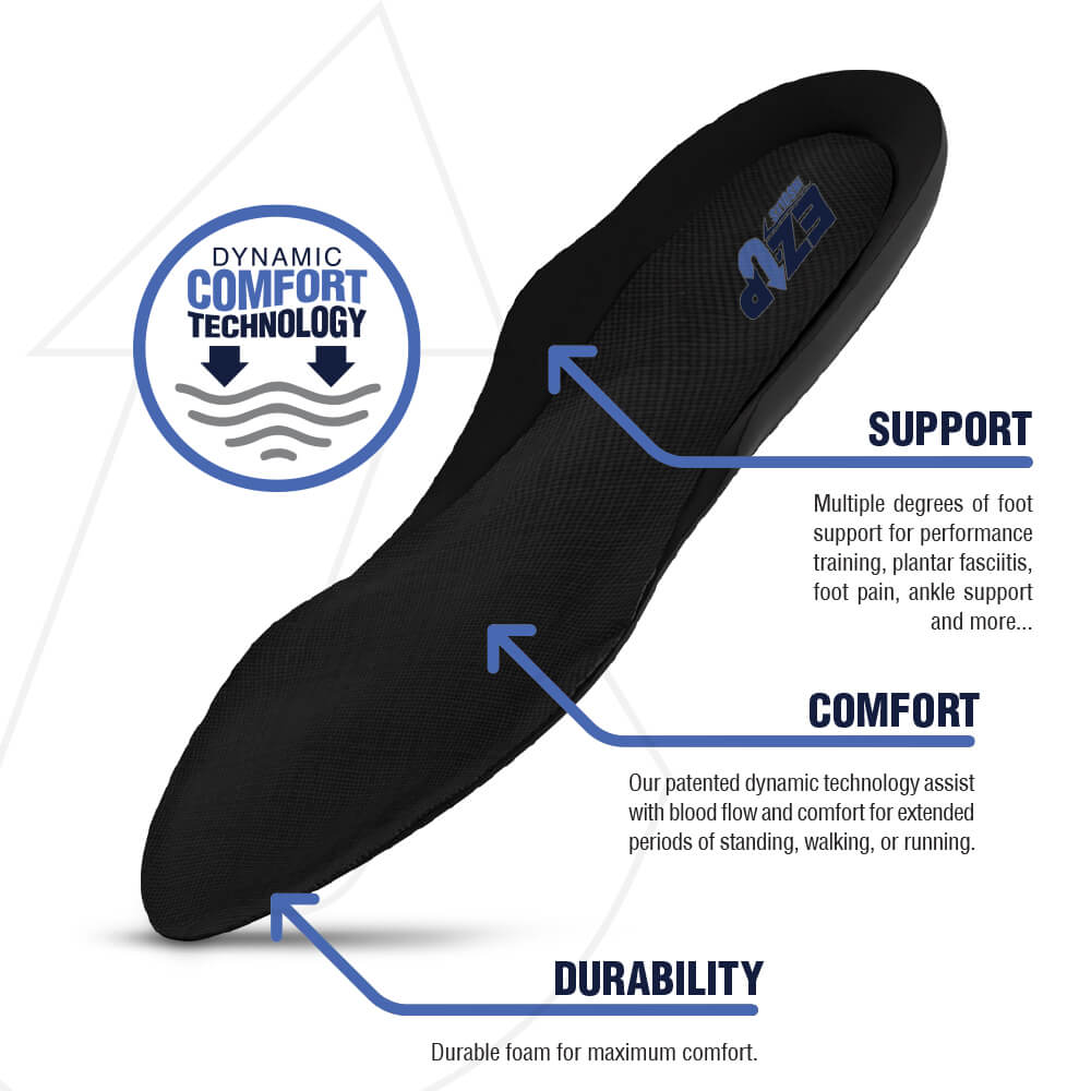 Experience unparalleled comfort with EZ-Up Insoles, providing all-day support for various biomechanical foot issues. The dynamic design ensures relief from discomfort, making them ideal for extended periods of standing or walking.